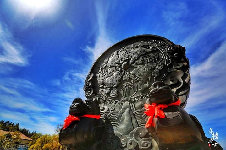 平波宝镜系大型铜雕,高6米,重1吨多。其创意源于王母娘娘尚方宝镜落地成湖的神话传说。这组雕塑仿渤海故国遗址出土的铜镜制成。这块铜镜,则是二十一世纪的产物,较之历代的铜镜有过之而无不及,堪称天下第一镜。它所展示的是对久远历史的美好回顾,是对丰厚传统文化的尊崇,也是对精湛的铸造艺术的传承。