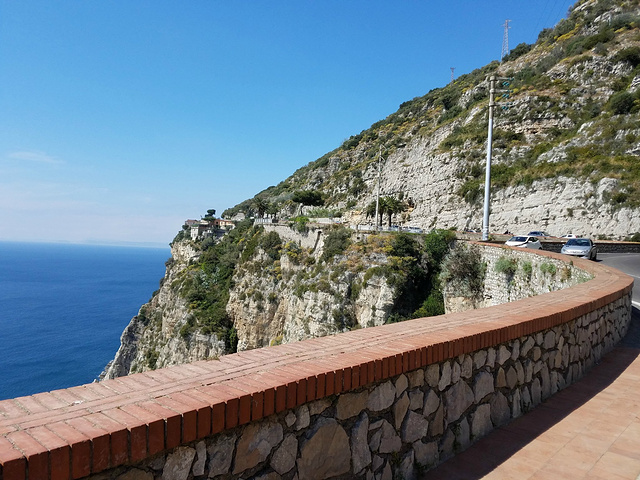 去程途中看見路旁靠海一邊有兩三檔生果檔,佈置得十分美侖美煥,但因走山邊一旁車道,同時仍在熟習意大利的駕駛文化中 - 雙白線超車、有需要任何車道旁可泊車,超車後在你車頭很近處切入、長度不夠泊車就只需將車前半部插入即可、在蛇形山道車速可達80~90公里/小時、切線不用打燈,因此未有切線到對面停車拍照,留待之後再路過才拍照吧!