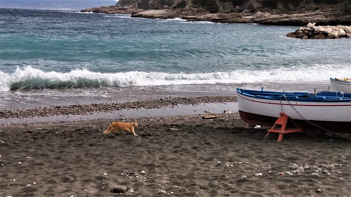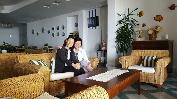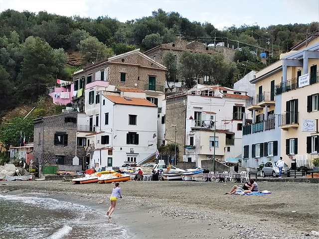 這個海灘背靠一個小村莊,由於仍未是夏天旺季,沙灘很寧靜,只有三兩小孩玩足球,他們的玩樂聲更把海灘親托得更寧靜。在陽台聽萫海浪聲,心境非常舒暢。原來計劃是放下行李就出發去山中之城Ravello,此時大家都捨不得離開這小海灘,同時天氣好像不太穩定,不知回來時天氣如何,故都想盡享此刻,享受一下寧靜的海灘。我太太更換上了泳裝,在陽台拍了不少泳裝照,我也換了沙灘褲,在海灘散步和拍照留念,散步中發現面向海灘一邊的村屋有數間餐館,Google了一下,食評也不錯,就決定今晚回來海邊晚飯吧!。