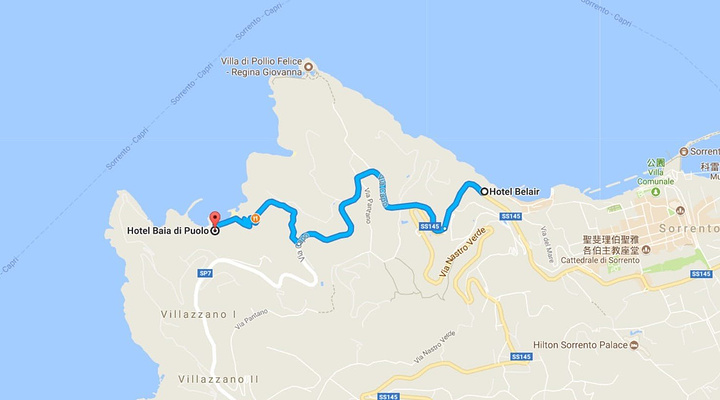 在酒店陽台食完在 Hotel Belair最後一次半自助早餐後,就checkout 去我們的海灘酒店- Hotel Baia di Puolo,車程10分鐘內。我們依舊先在GPS 及Google map設定好地點,便依導航指示進發,轉入一條很窄的下山小路,一直走到接近山腳時,到了一個停車場的閘口,有管理人員詢問我們要到那裡,我們說明目的地後,他們說這條路祓走不通的,要出大路再向前走至在下一個义路。按原路出到路口,看清楚在路旁一個大牌,上面有若10個左右酒店或餐廳名,有一半的都指示需向前走,義大利經常會見到道路入口旁有一些大牌,其上有很多指示,但必須把車泊在一旁慢慢看。