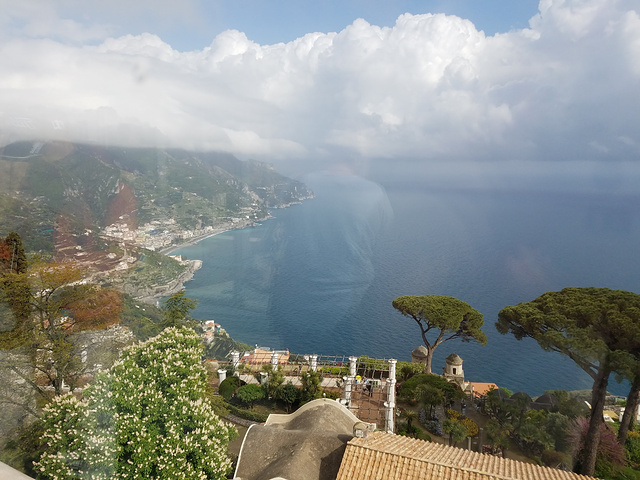 終於走到了山頂,天氣也有些好轉,極目遠望,遠處時晴時雨。我們也要找地方泊車,由於此城鎮範圍是ZTL -- 交通管制區,在義大利有很多古鎮都會是ZTL,只容許鎮內居民駕車進入,又或一日中某一時段。由於我們在計劃行程時已知此鎮是ZTL,故已事先在Google 地圖找到了停車場,當`我們到達時,在ZTL前的泊車位已滿,故就在ZTL前左轉下山,去之前搜尋到的停車場泊車,這是附屬於一個有現代建築設計外形的表演場地,泊車場很大,有足夠停車位,這是自助服務的,出入口沒有升降欄杆,泊車後欲在車場內找售票機,但找不著,走出車場外才有兩台,一台按鍵沒反應,另一台在我們入至第二個硬幣時就卡著,無奈只有放棄,當我們走回Ravello時,在中途遇到了其他國家的遊客向我們求教使用泊車售票機,但我們也是愛莫能助。