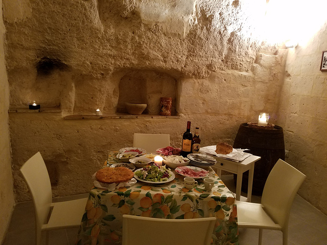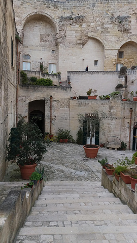 今天會離開Sorrento,向東南走到巴西利卡塔大區的Matera,這個小鎮所在的小峽谷是由Gravina 河的侵蝕而產生。 馬泰拉是因為Sassi 石窟民居的歷史而聞名於世,Sassi 是義大利文石頭的意思。這裏的石窟民居自1993年起,與石頭教堂公園成為聯合國教育科學文化組織的世界遺產。清旱起來,收拾完行李,就到酒店外的露天進餐區去食早餐,早餐由一個老伯為我們準備,這段時間入住的人不多,可能只有4、5個房間有人,我們到來的時間,已有其他人先到,這裡的早餐當然不能與之前酒店的相比,但有些失望的是沒有熱食,連熱多士也沒有,只有熱飲提供,胡亂吃了些就上車了,不過也拿了幾包餅乾作不時之需。
