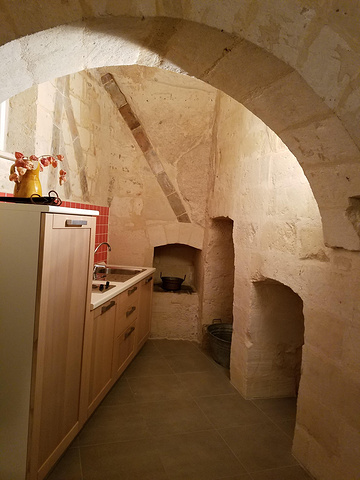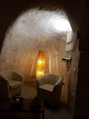 我們卸下行李後,就按之前在Google地圖實景中找的路線上山,其實之前需多次嘗試在地圖實景中確認民宿的位置,但每次在非常按近時,只看見一個維修中的地盤,今天真是實實在在的在陽光下拖著4個行李爬階梯,好彩的是氣溫不高,爬了約5分鐘左右就到達了在實景中看見的地盤位置,正正就在一條分义路口上,當然有哨兵即時分頭偵察,不一會哨兵回報往左走,走不到二十步民宿就出現在我們眼前,但是若不是之前上網預訂時,看過民宿的正立面,也不會知道在一個小廣場內由已荒廢民居洞窟改建的,就是我們今晚入住的民宿,若要形容這應是以保育方式營運的民宿環境,可以用' U '來說明,在U字最凹入的地方是民宿辦事處及早餐用餐廳,同時有一間裝潢頗高格調的餐廳,所有住房就在正中間有一條階梯爬上去,至於剛才經過的地盤是在U字的前端,是仍在修復中的洞窟房間,可能是這民宿的擴充部份。