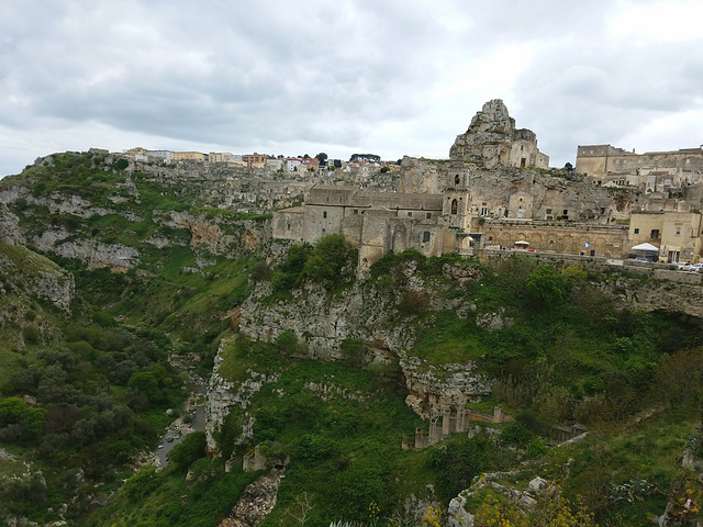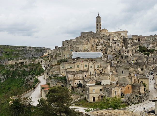 我們在下午2:30左右到達Matera,當按著Tablet上Mapsme導航駛入古鎮時,發現那條單程路竟有車從反向駛出,幸好車速慢及駛入前已發現路口好像有反向單程路標誌,立即倒車駛出,當然是遭怒目相視,記得車上是一對母女。於是轉用車上GPS及Google map導航,終於找到了正確入口,之前在計劃行程時,在網上看過一篇遊記,說到有鎮其中一住宿提供接送服務,當時派車到火車站接寫遊記的旅客,司機告訴這旅客,當轉了下一個彎你就會因為眼前景物而譁然,而這旅客真是超high。當時看了這段,我心裡也覺得只是他大驚小怪吧! 但這次我真實告訴大家,當車駛過了一個彎,進入下山的Matera古鎮小車路時,你不可能不為眼前震撼的景色而讚嘆、嘩然!!!
