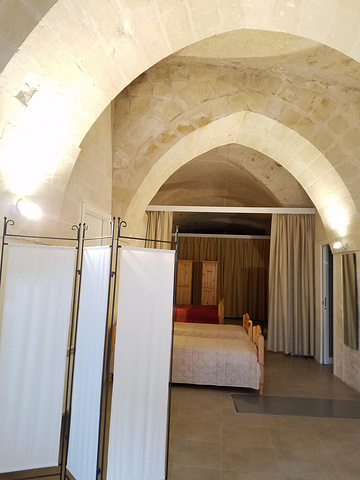 當我們走到辦公室外準備辦理入住手續時,發現門及燈也關了,未有人在內,走到旁邊的餐廳了解一下,應正是中段時間休息中,幸好接待處有人,她說民宿應下午4時才辦公,她也幫忙通知一下民宿的人員,這也只好利用這時間去周圍拍拍照。等了若30分鐘左右,有人回來了,辦理完手續後,就帶我們爬階梯到今晚渡宿的房間,一入到我倆的房間時,見到有廚房及飯廳,而我旅伴那一間則沒有,之後安頓下來再探索時發現,我們的房間共有兩張雙人床、兩張單人床及一張嬰兒床,中間用兩張布幕間開成三個間格,所以將兩張布幕拉開,這房間的縱深是非常深的,有兩個淋浴間,所以後來我和太太可以同時各自獨用一間淋浴間,也因我們房間有飯廳及餐具,所以也誘使我們購置食物回來用餐。在這些洞窟房間的牆上有很多凹陷小空間,應是用作放置物品及燈臺。