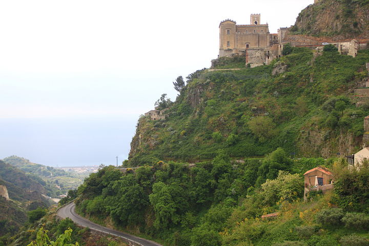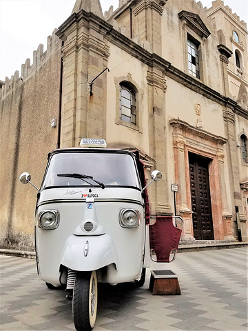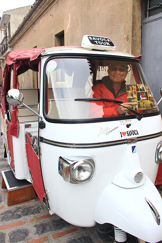 篤篤車司機也算是交足功課,主動幫忙我們拍照,談話也頗風趣。教堂門沒有打開,不能入內參觀,只有在周圍轉了一圈就坐車下山了,由於是下山加上路面凹凸不平,感覺比上山更危險,不過車程很短。回到村口時,剛好有其他旅客到達,氣氛即時熱鬧起來。我們在Godfather場景的酒吧斜對面店鋪買了些與Godfatehr電影有關的紀念品,也是時候向Catania進發了。