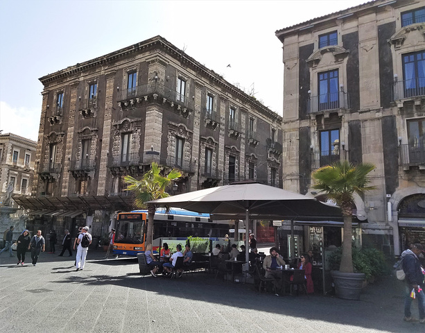 左面是Cattedrale di Sant'Agata,中間是Porta Uzeda,右面是Seminario dei Chierici,它們都用了黑色火山岩作外牆。