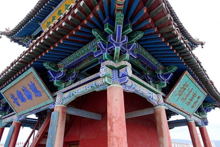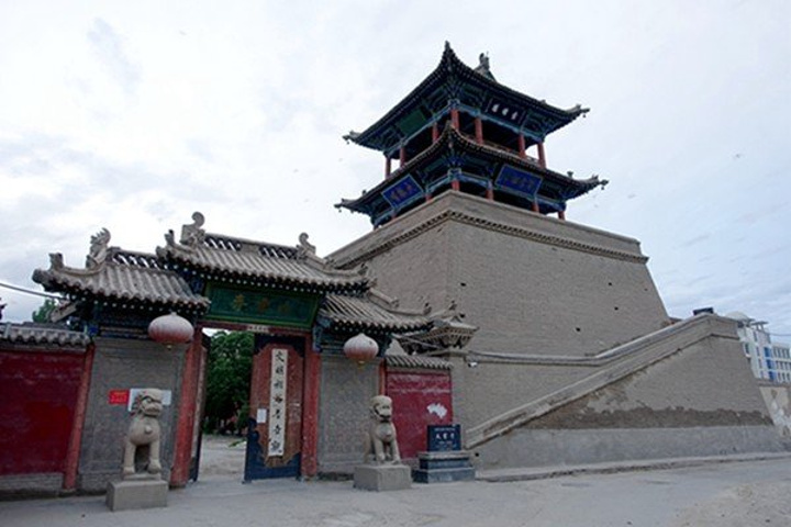 1927年大地震后仅存的古钟楼。钟楼建在9米高的砖包土台上。楼为二层,四周绕廊,重檐山顶,五踩斗拱,下饰风铃。