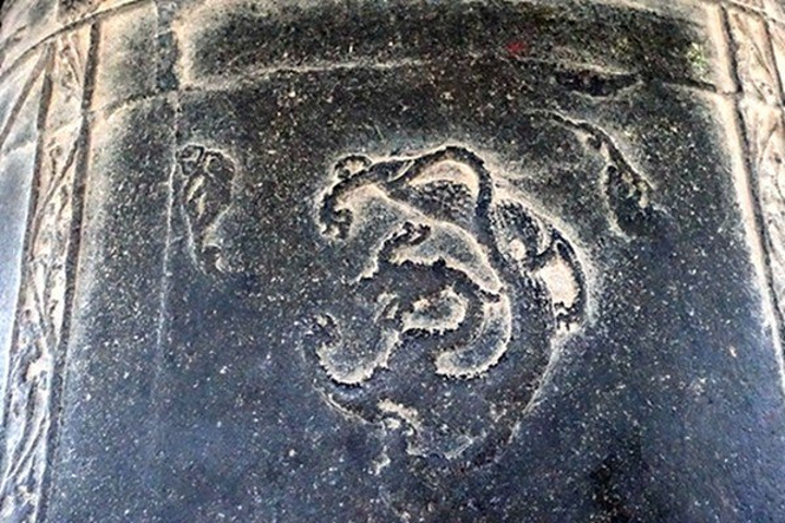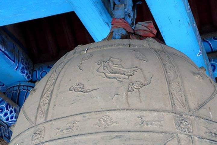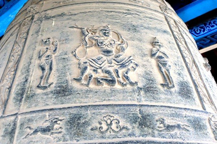 钟体上饰有图案3层18格,上层饰飞天,中层饰天王力士,下层饰龙。