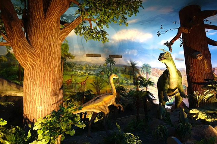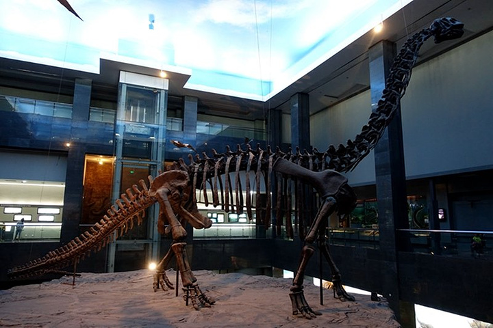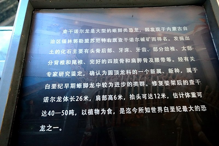 镇馆之宝:查干诺尔龙。查干诺尔龙是四足行走的蜥脚类恐龙,因发现于内蒙古查干诺尔而得名,属于蜥臀目、蜥脚亚目、圆顶龙科,以植物为食,是目前亚洲最大、也是世界白垩纪最大的恐龙化石,约有四层楼高。
