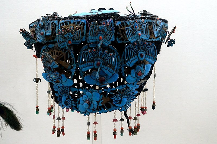 鎏金银翠鸟羽饰凤冠(清代)。凤冠由铜丝缠裹黑缎编成网状骨架,上饰十四只点翠银凤和九朵点翠牡丹花,两侧插凤衔珍珠坠步摇、嵌宝花瓣形头钗等。此凤冠雍容华贵,精致美观,为下嫁蒙古王公的清公主陪嫁之物。