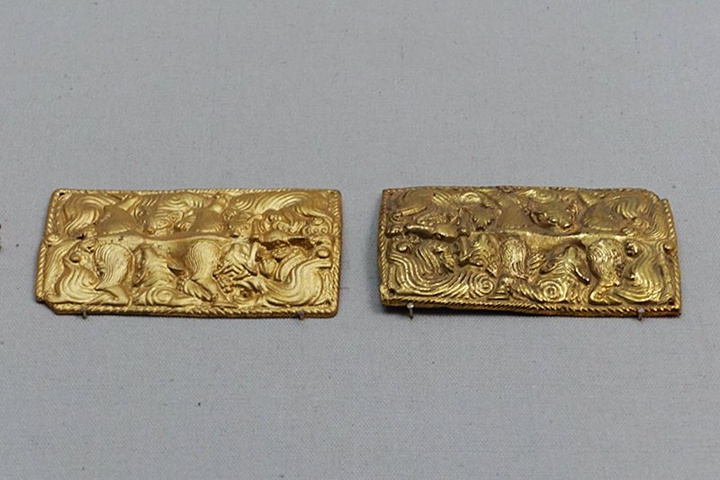虎咬牛纹金带饰(战国)。长方形带扣为黄金模铸而成。绳纹边框内浮雕四虎咬牛纹图案,采取俯视角度,牛居中于平分线,卧姿,四肢平伸,四只猛虎两两对称分前后两组分别噬咬牛的颈、腰部,牛奋力反抗用双角刺穿虎耳,靠近牛头一组虎耳为牛角所刺穿。