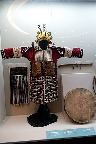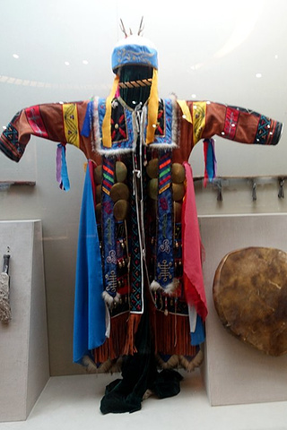 达斡尔族萨满法服(清代)。此法服由鹿皮和布制成,达斡尔族萨满服最有特色的是神裙,裙下缀许多五颜六色飘带,象征鸟羽。