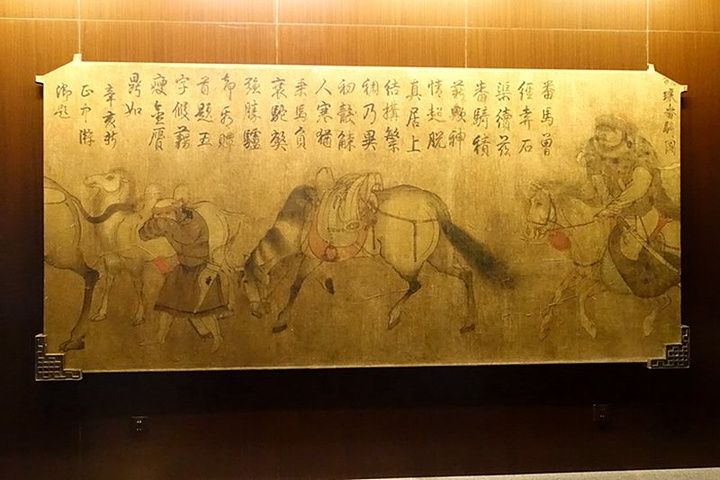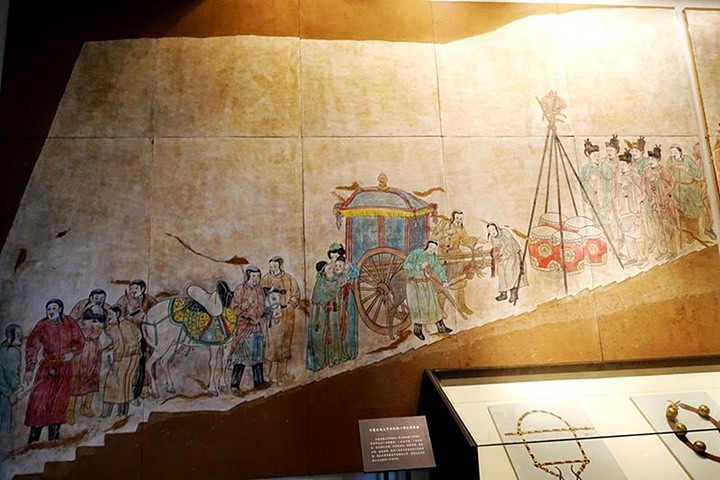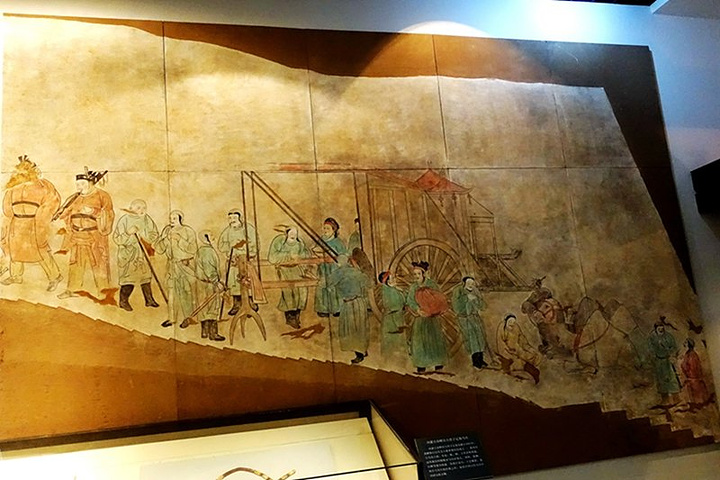 内蒙古通辽市库伦旗一号辽墓壁画《出行图》。壁画长26米,场面宏大,构图合理,造型生动,画技高超,表现了契丹大贵族游玩行乐的情景,是辽代墓葬壁画中的精绝之作。