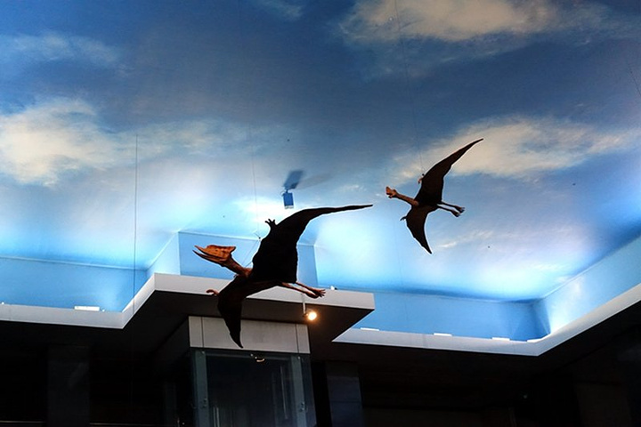 查干诺尔龙的头上蓝天背景下悬挂着的翼龙