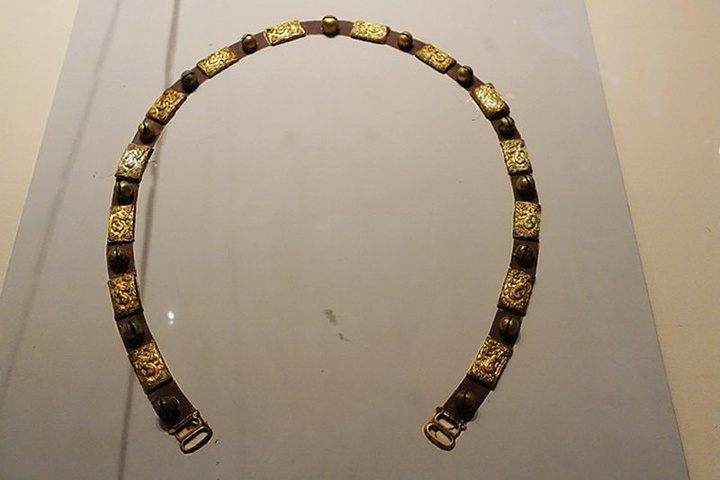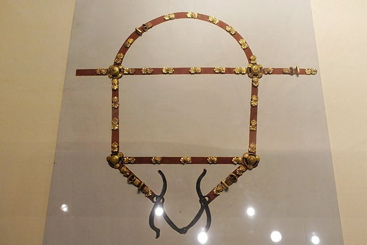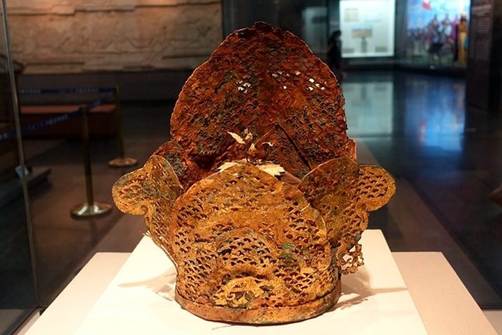 镏金铜冠(辽代)。 以鎏金银冠或鎏金铜冠随葬的习俗,辽代契丹贵族为最盛,而且大部分都出土于赤峰一带。