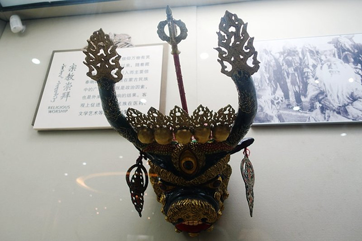 清法王骨雕佩饰(清代)。由驼骨磨制、雕刻、串连骨雕佩饰。作佛事活动时,护法神巫佩带此褂饰,跳多种舞蹈动作,以此来降服恶魔、护佑众生。