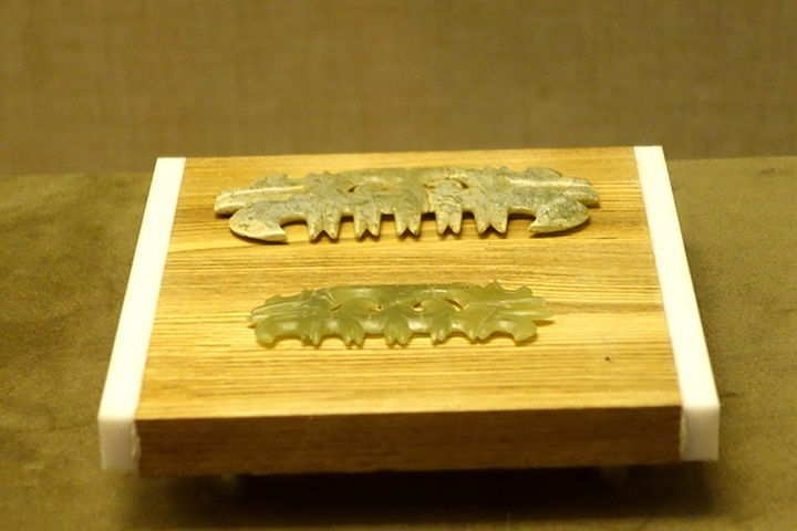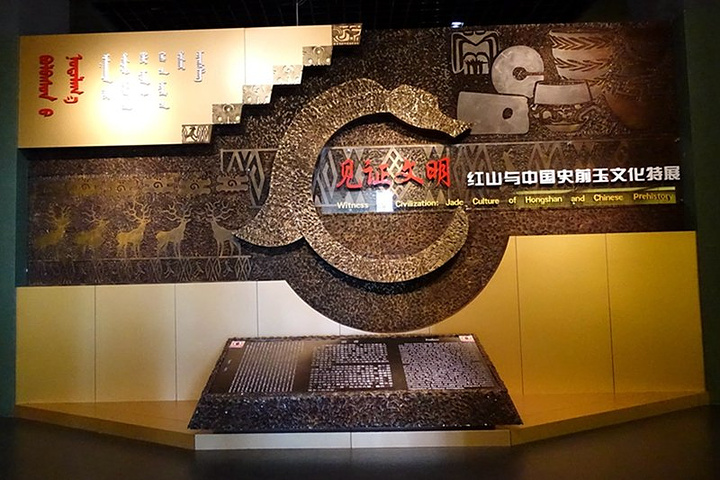 碧玉龙(复制)。 红山碧玉龙是红山文化的代表玉器,1971年8月于内蒙古自治区赤峰市翁牛特旗三星他拉小北山出土。系原始社会新石器时代的红山文化遗物,距今已有近六千年的历史。因此被誉为“中华第一龙”,成为举世无双的“国宝”