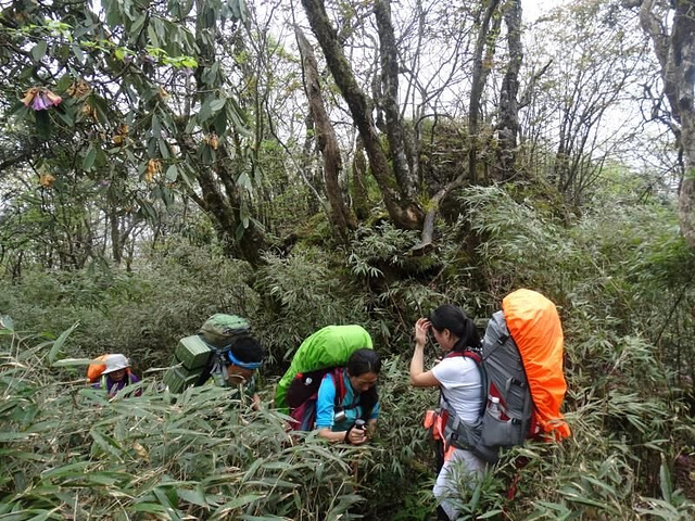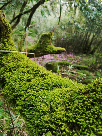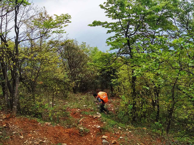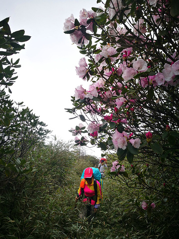 我们走到了半山腰,不时会有人停下脚步休息,放下背包分享自己携带的零食。昱昱缺乏户外经验,我安排走在队伍中间的喜鹿照顾她,虽然缺乏经验但她非常有毅力不怕艰险,最后是坚持走完了全程。蜗牛、莎子和小草也走在队伍的中间,不时给大伙加油鼓励,是队伍是不可缺少的精神支柱。邵兵在前面开路,他是一个手机摄影爱好者,一路上给大家拍照,分享各种照片。山上的杜鹃花,红似云霞,身至其中,竟不知先抚摩那一树,不知先亲吻那一丛,惊叹中,只想把自己融入花丛,与它合为一体。