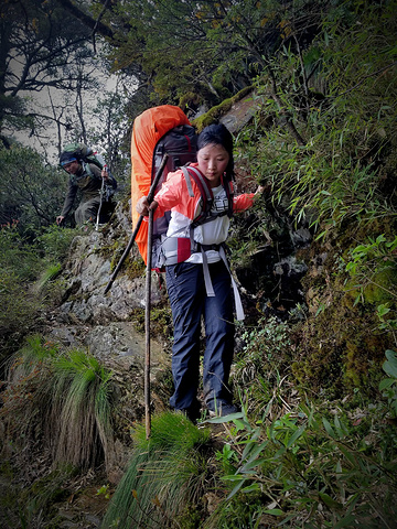 下午四点,我们路过薄刀岭,那是个比较危险的地方,需要在悬崖峭壁上攀爬,坡度大概80度左右,辉郎和素言缓慢爬过危险区后,转身协助大家安全度过这个危险的地方,这次活动他俩为我们这个团队贡献了很多。当前面的大部队都已经爬过了薄刀岭,而我跟墨墨还走在队伍的最后面,与他们相差可能半个小时左右的路程,在路上我不时会对墨墨说一句,“快走啊再不走我就打死你”,这句话至今她都还铭记在心,为什么我会这样说她,其一是以前曾经参加过话剧有这个桥段,已经变成了我口头禅,其二是她没走多远就会停下来,放下背包休息,我们都还没有过薄刀岭呢,和前面的队伍距离拉得实在是太长了,不能按时到达营地就会变得危险,我内心十分的着急。后来在山上我答应她,下山以后我给她买冰冻的红牛,然后微信给她发200的红包,就这样我们才能坚持过了薄刀岭。我们走过了几个山脊后,放下背包休息,墨墨分享了她唯一的一支能量胶,我俩每人一半,吃了能量胶感觉整个身体瞬间能量爆炸。