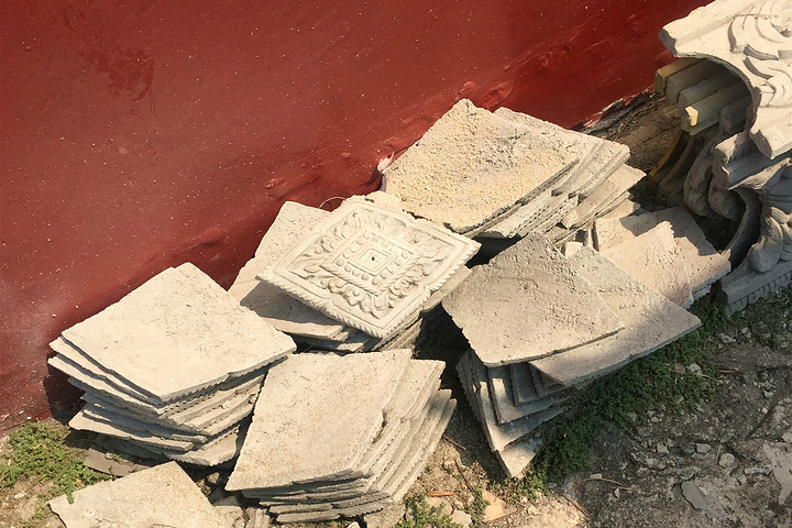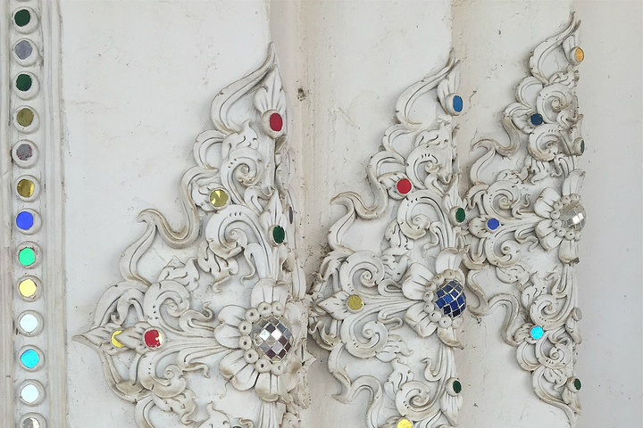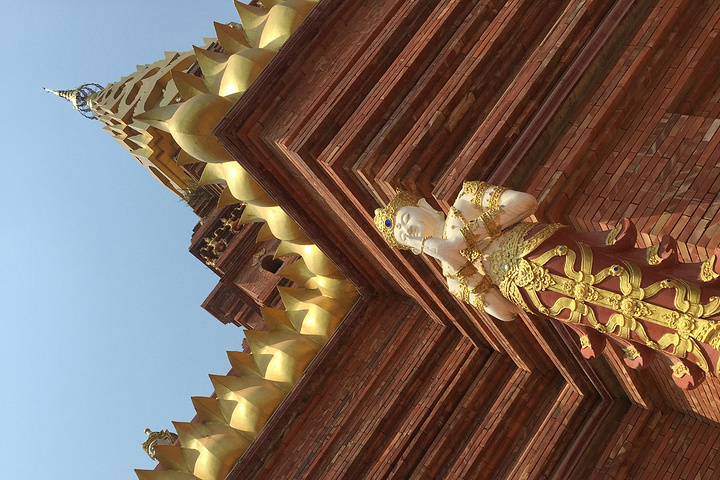 红底描金,具有佛教意义的莲花和卷草叶,是当地傣族寺庙的彩画装饰标配