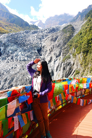 到了一个下马处,约是在冰川脚下,我们就得下了,剩下的我们要自己走,这里一定又是个神圣的地方,林子里栈道上都挂满了经幡,五颜六色的在阳光下鲜艳夺目。终于走到了最高处,眼前的冰川没有想象的好看,因为冰川上面覆盖了一层黑乎乎的灰,但从侧面可以看到这十足是一条长长的冰带,且幸运地碰巧看到一处小小的雪崩,或者应该说是冰崩比较合适,冰川的一个洞口处有冰裂开落下,有轰隆隆的声音。原本以为来冰川游玩会很冷,特地带上了毛线帽,想不到是我多虑了。