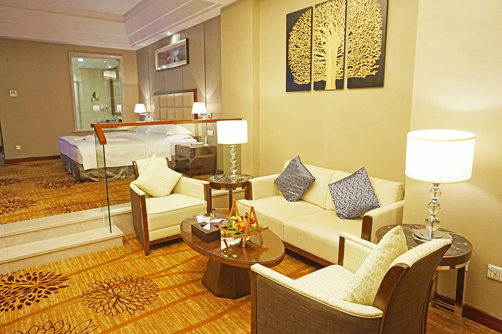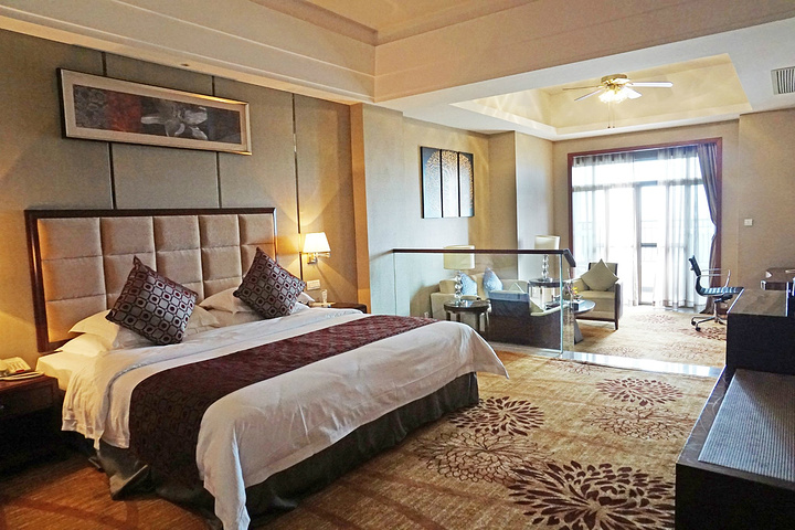 我的房间位于主楼的六楼,也就是最高楼层了,是整个酒店区域观景较佳的区域了,进入房间,我预定的是大床房,房间呈纵深结构,从门口开始分为浴室,房间,阳台三个部分,而房间内的玻璃隔拦和小阶梯又将房间分为了两个区域,卧室和客厅,卧室部分舒适宽敞的大床,咖啡色的床饰和背景墙配以暖色调的地毯,进门便给人以温馨回家的感觉,床头闹钟,床头夜灯,饮水茶具,小冰柜等等都一应俱全,唯一我不习惯的地方就是,卧室部分为了考虑睡眠,而没有安装顶灯,客厅部分装有环形的灯带和复古电扇造型的灯具,照明亮度也是足够了的。