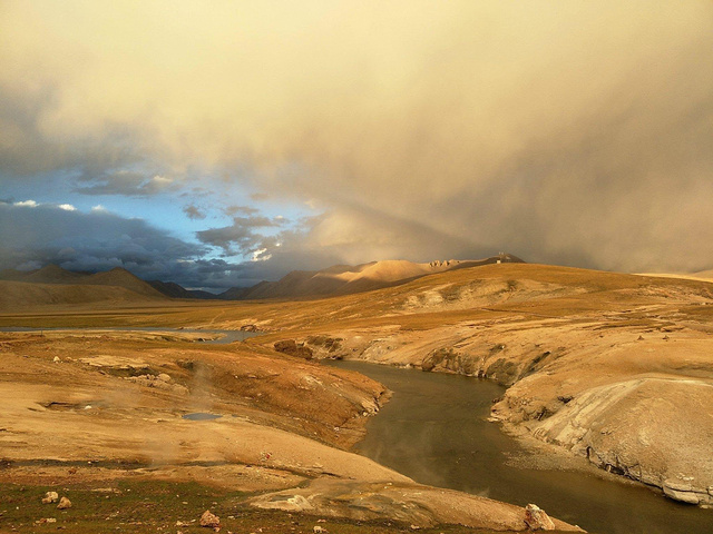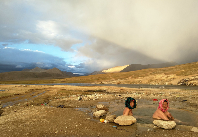 西藏温泉很多,全是天然的地热温泉,不过在高原上你泡不了多久就会觉得累,可能泡了20分钟左右吧,我们就准备离开,却看见了温泉的黄昏,那时候有点点下雨,不过很小的雨点,却让我看到温泉的美丽一面,黄昏的这个温泉太美了,手机不停的拍照,还拍了当地两个人,当然是询问过她们的,不是偷拍哦。对了忘了说了这个温泉不收费的,免费的(大笑)(大笑)