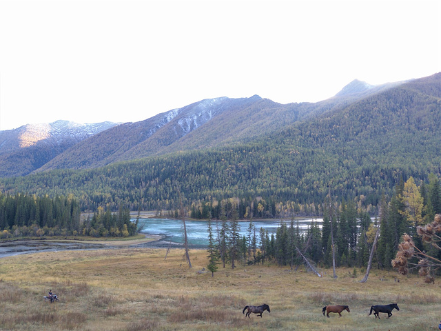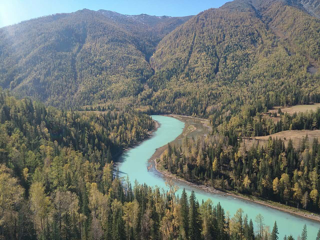 额尔齐斯河也要从镇中穿流而过,便是镇名的来历。可可托海,哈萨克语的意思为“绿色的丛林”。蒙古语,意为“蓝色的河湾”。可可托海我到的时候,草不算很黄,树叶也不黄,完全不想网上的图片一样,严重怀疑到了个假的可可托海,都没心思拍照了(生气)