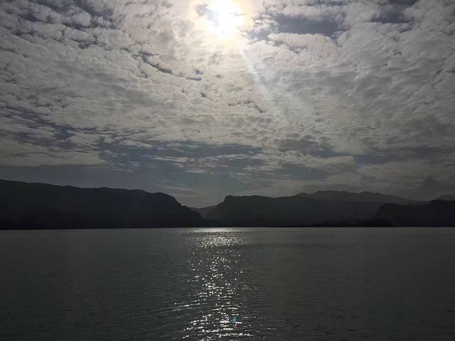 背光拍的,阳光穿过云层,洒在湖上,波光凌凌,很是好看
