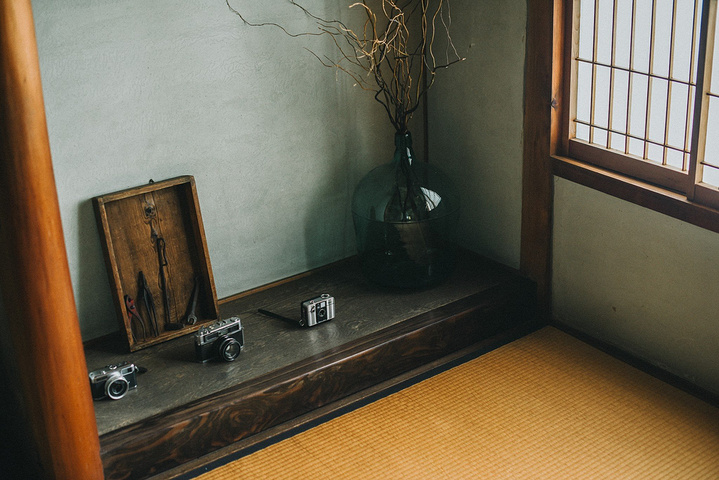 茶室里放着三个旧式的胶片相机,每个我都拿起来观察了一番,虽然都没有办法使用,猜想大概是屋主人的藏物吧。