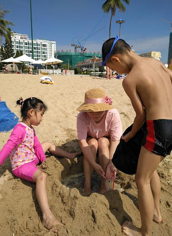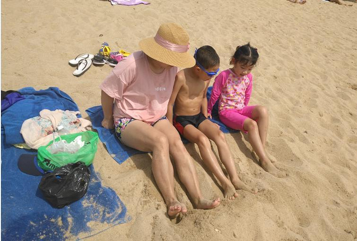 (PS:儿子说要把阿姨装扮成沙滩美人鱼… )因为对第一天的泥浆浴意犹未尽,所以大家来了个沙浆浴顺带免费的足底按摩。