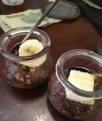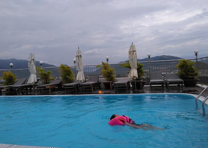 点了一份Mix seafood,份量十足,一份Mix rice,米饭拼盘颜色很好看,两杯越南咖啡,两杯西瓜汁。待真正上餐的时候才发现我们4人根本吃不了那么多,再看看临桌的外国客人点的餐,顿时感觉不好意思,我们就是铺张浪费的典型。总体味道还是很不错的,但是我们确实吃不下,所以打包回酒店,准备当晚饭。(PS:儿子全程都很极积的使用他学到的英文单词,这是第一次他主动愿意开口讲英文,我很开心,任由他自己去交流)结账后餐厅赠送了4份甜点,看起来很可爱的点心,不知道叫什么名字,我们称它为香蕉巧克力酱,对于我这种狂爱甜食的人来说都甜腻了,伙伴们可想而知,总之是一顿愉快的用餐(PS:此顿用餐花费74万越南盾)。 午餐后为了抓紧时间享受自由,回到酒店后稍稍休息了一下便换上泳装去顶楼的游泳池感受,因为是酒店内部的,只针对入住客人,所以没什么人,刚到的时候还有两三位外国客人在游,后来可能是我们的小朋友太闹腾了,就只剩我们4人了,完全是包场的感觉,随意畅游。儿子又为了展示他的泳技,吵着不穿救生衣,我也想看看他之前的训练成果,便同意他自己游,小家伙开心死了,不停的表演…