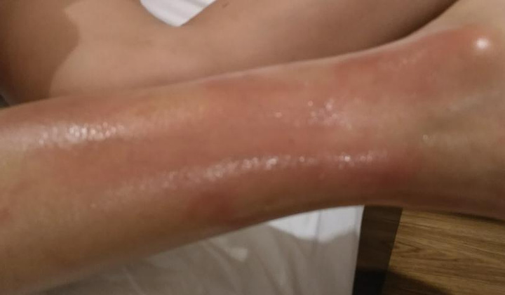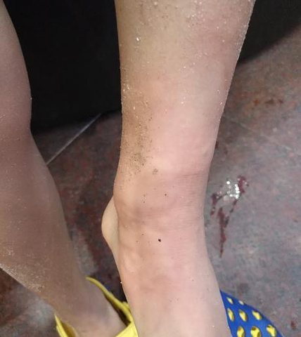将近18:00时,海水涨潮了,大部份游客离开了海滩,我们4人依然坚守在海边。 突然儿子尖叫一声跑到岸上,又跳又吼的说被刺了,我当时没反应过来,以为他被小石头之类的划伤了,结果后面才发现是被水母刺伤了(PS:第一眼看到真正的水母时,伙伴以为是塑料袋,我则以为是哪位不讲卫生的乱扔的灯罩,因为形状看起很像,后来转念一想,不可能),心里瞬间紧张起来,不知如何是好(PS:之前没有看过相关攻略,也没有了解过相关知识,所以突发意外后六神无主),赶忙带上儿子回酒店,但是由于语言不通,只能紧急联系导游告知情况,然后按照导游指示去药店购买了药膏涂抹,观察约1小时后,儿子说痛感从先前刚刺的穿心痛到现在变为阵痛,但是腿部却从刚开始的像蚊子咬后一样的小包状演变为红肿状,我心里没底,很是担心,怕越来越严重,所以立即又联系了导游,请他带我们去当地医院,因为时间已经是当地的20:00,只能急诊看病了,医生先是给儿子测量了体温,没有发烧,又看了看他的腿,说没什么大碍,不需要开口服药,只擦药膏即可,红肿会慢慢消退,此时我心里稍稍有了点放松的感觉。回到酒店后,让儿子早早休息养伤。
