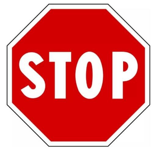 这个在城市里极为常见,一般是个竖立的红色八边形STOP标志牌,在临近的路口地面上也会有白色的STOP字样。看到这个标志,无论下一步动作是左转、直行还是右转,都要先停车查看,所谓停车一定是刹住车,而不能减速缓慢通过。如果另一侧即将通行的车辆前也有STOP标志,则先到先行。
