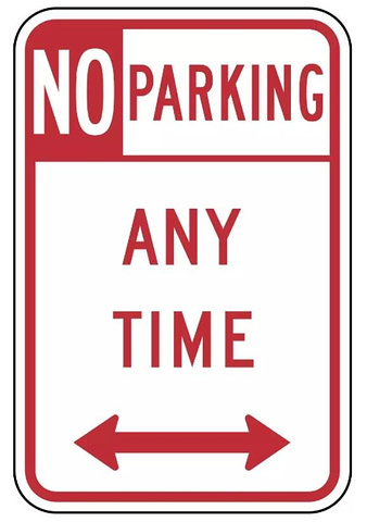 禁止停车标志。如有“ANY TIME”字样表示任何时间都不能停车;有的是在固定时段可以停车;也有的可以停车但是会有时间限制,例如30分钟或2小时;有路面不能停车但是路肩可以停车的;有的仅可以停车卸货的等等。一般“NO PARKING”下面会有英文注释,大家注意看就行。