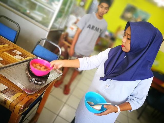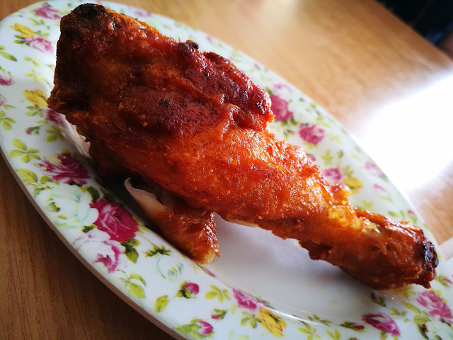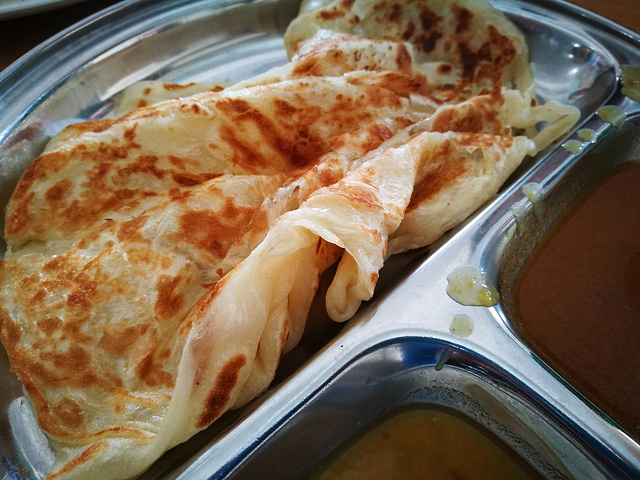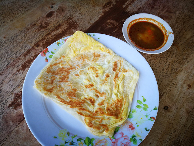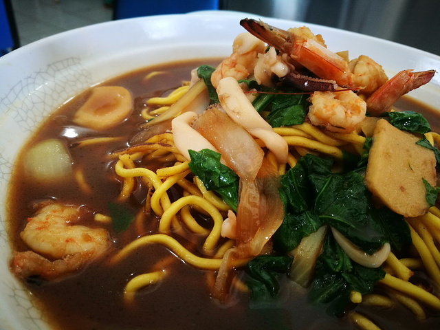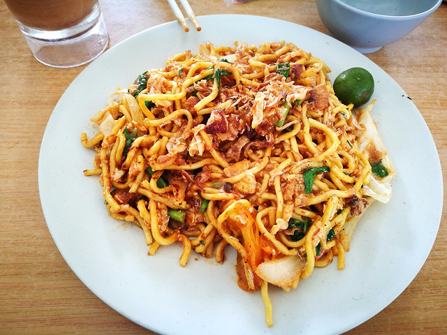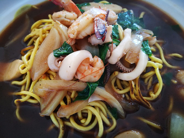 不管到哪里,我都喜欢去找找本地人吃的餐馆试试,并不局限于酒店餐厅,一直就觉得东南亚的粉和炒饭都不错,我放弃了酒店早餐出去觅食。出了酒店左手有一栋商务楼,一层是底商,当地人在这里吃早餐的比较多,当然是哪家人多去哪家了,吃下来发现几家小店的海鲜炒面、海鲜汤面、烙饼和炸鸡腿都非常好吃,不由庆幸放弃酒店早餐是个正确的选择。