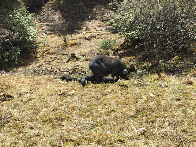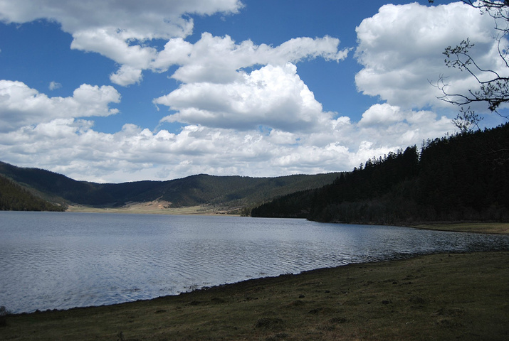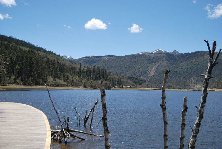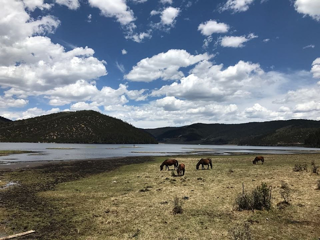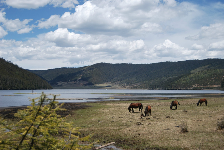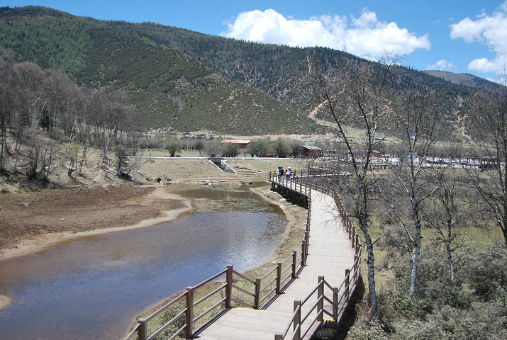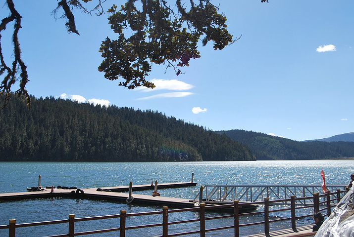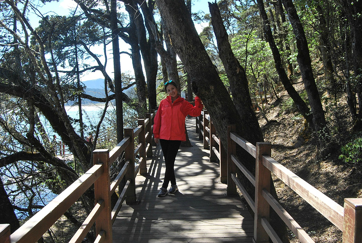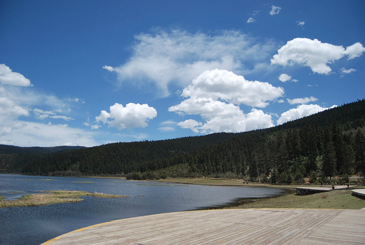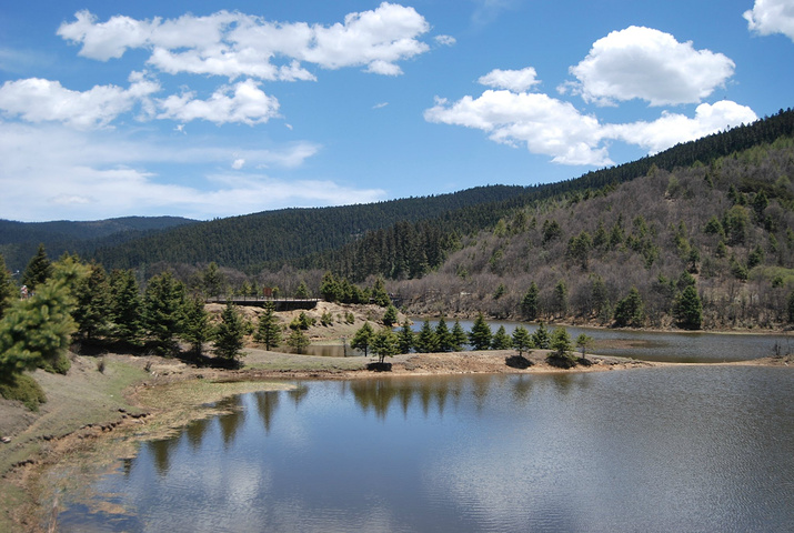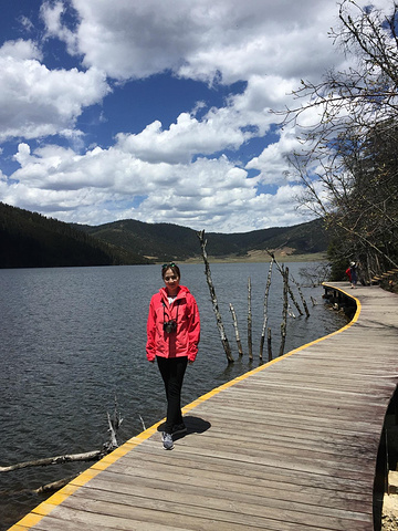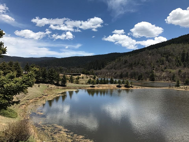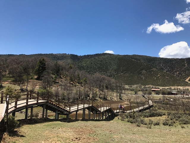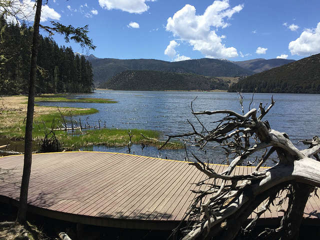 蜀都湖步行栈道约1.4公里,还可以坐船10分钟到下一个停车场50元每人自费,或者就不下车直接坐过去。我们本来是想坐船的,后来发现景色太好直接走了,事实证明走是对的,路上可以闭着眼睛按快门随便拍都是桌面,还碰到一头应该是家养黑猪带着十几头小猪,很可爱也不怕人,后来还碰到好几只小松鼠,也不太怕人了,喂了它提前准备好的花生,像马啊牦牛啊鸟啊什么的都不稀奇了,3点左右吧我们坐上大巴开始往下一个景点儿出发,十几分钟后到了牧场观景台,拍了照片就往下一个景点儿。