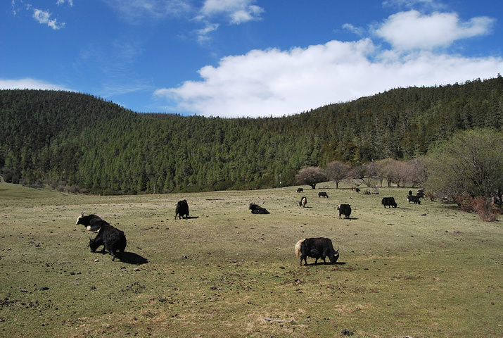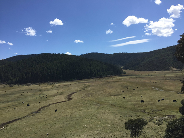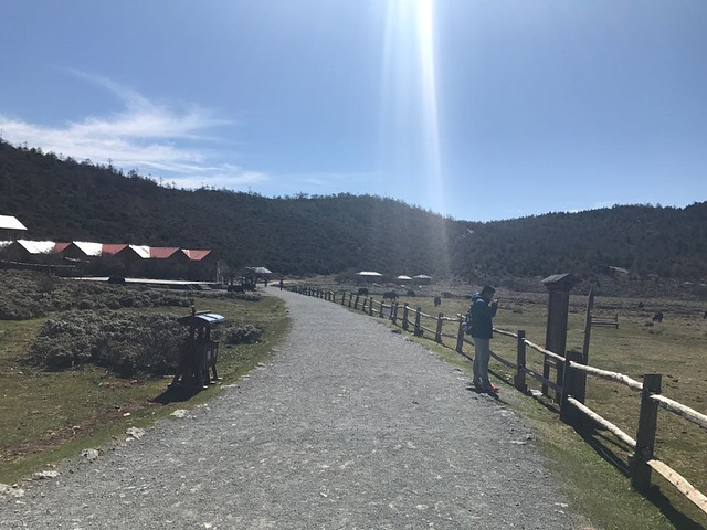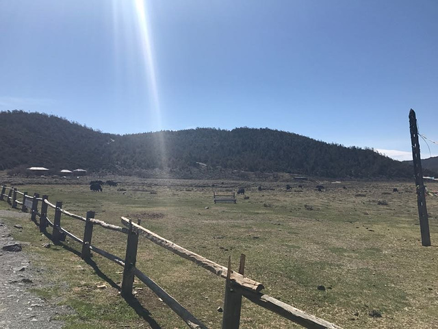 山上景色挺不错的,光照很强拍照根本不用美颜,远处能看到梅里雪山。停留一阵子我们乘索道到中段的牧场,也很漂亮,牦牛满草地吃草,远处草场跟山连成一片,不过满地的牛粪马粪还是味儿挺大的,停留一会我们就下山了,到山下快12点了,我们直接去普达措,路上大概要1个小时,在车上吃了点面包之类。