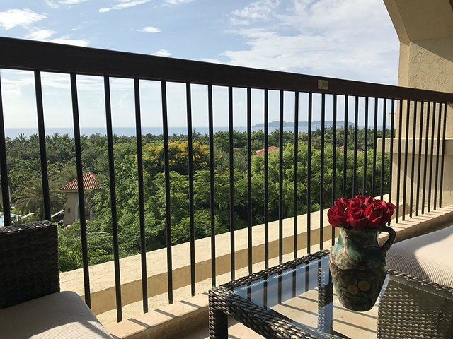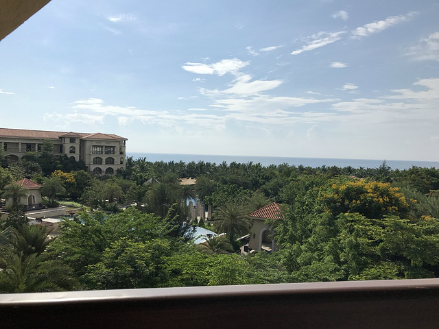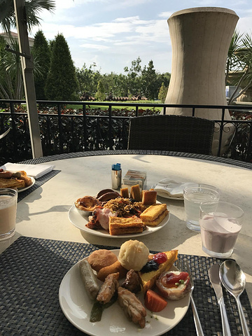 因为我们今天要去免税店,所以早上起来早了一点,去吃自助早餐,这边的服务员有好多中亚小哥儿,中文都不号,不过挺热情,早餐也非常棒,不过吃饭的人少很多,我们坐在餐厅外边露天的桌边,吃的也很嗨,同时又欣赏了美景。