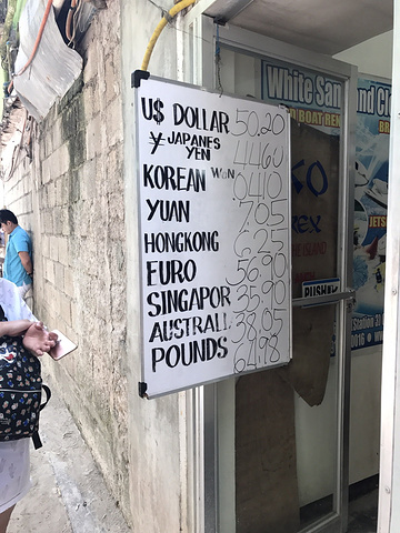 比索可以在北京机场兑换,1:6.8,还算很高了,因为当你到了长滩岛你会发现人民币兑比索汇率不是很高。最好的就是带着美金,因为美金的汇率在长滩岛很高,最好的一家可以达到1:50.2。