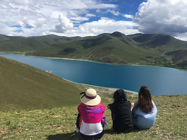 这是阿根拍的原图,我们三个女孩子坐得有点不想走,真心美得不像话,青海湖跟羊湖比,不是一个级别。