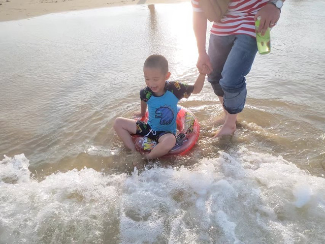 吃完晚餐带着孩子又漫步到沙滩边上,夜晚的沙滩大海退潮退了一大片,孩子带着挖沙工具在沙滩上挖沙玩的不亦乐乎。