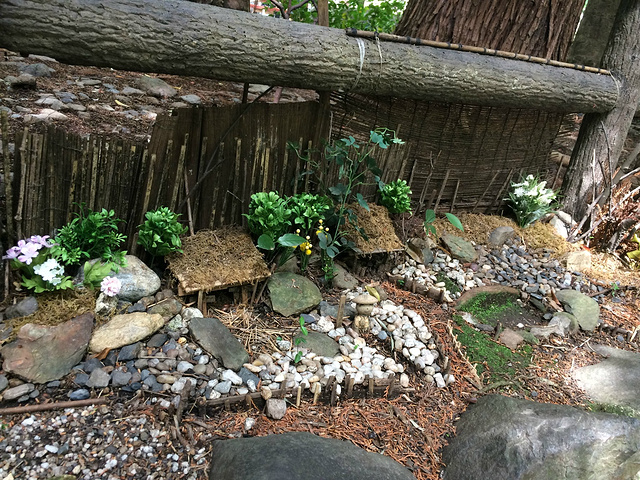 仔细看。像不像小时候玩住家家搭的小屋子,很细致,采集大自然的物件组建成一个迷你小花园。小草屋、石子路、木栅栏、花花草草,应有尽有,仔细看还能找到这个迷你小花园门口放着用石头堆砌的门神呢。很想认识这位有童心的摆设者!