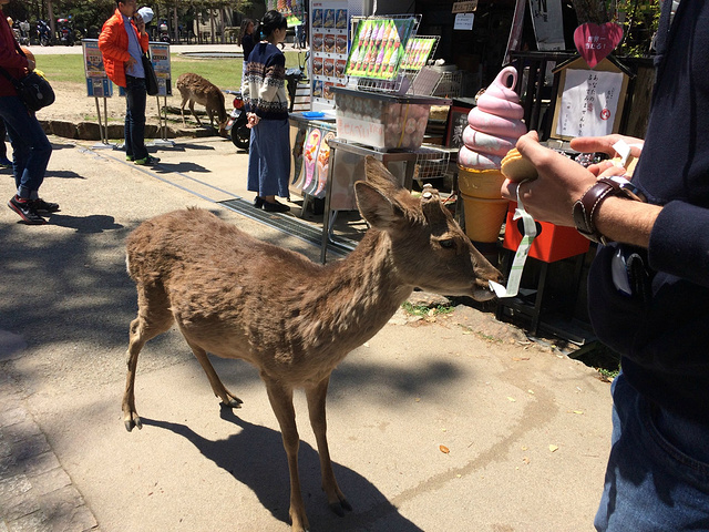 小小的经验:不用急着一看到鹿就马上买饼干,一些比较“精明”的小鹿会围在公园外面的小摊等着旅客。到春日大社门口再买比较合适。