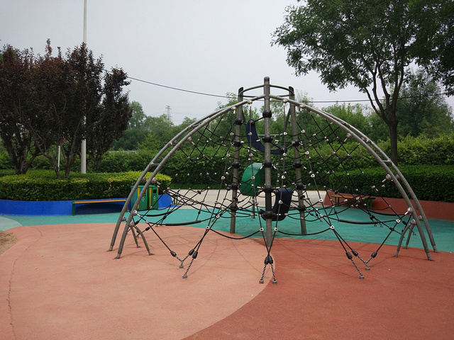 这四个大滑梯是这里的主旋律,在它们周围还有无数个拓展设施围绕。你看这样的架子在这里都是经常见到的项目。