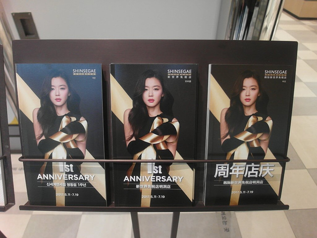对了,新世界免税店的代言人是我们的女神姐姐全智贤姐姐哟~那个旋转秋千的边上都是女神姐姐的画面,美到不行!现在免税店在搞活动~针对外国人有超多的优惠,来的时候记得拿上一本女神姐姐的小册子,看看有哪些优惠是可以用的哟~