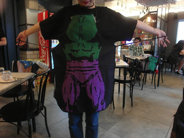 这家店还有一个特色就是,所有的围裙都是肌肉男!超级好笑哈哈哈哈!我的是像葫芦娃一样的肌肉男啊!我家欧巴是超人肌肉男啊!超搞笑,大家来的时候可以选几个肌肉男一起合个影啊~哈哈