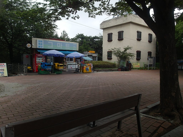 我坐的这个地方就是鬼怪新娘当时坐的位置,本来以为旁边会有垃圾桶,原来那只是个道具。这里并没有垃圾桶的说~从自由公园往地铁站走的路上,还有一个童话村~可惜天空不作美,走着走着下起了暴雨。只能随便找了一家咖啡店坐了一会儿。