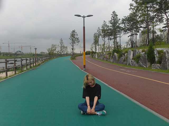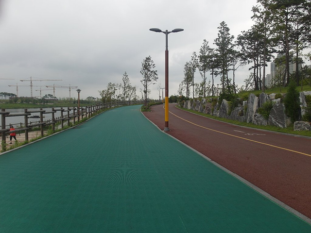 沿着湖边走着走大概5~8分钟就可以看到绿色的人行道和红色的自行车跑道~这里就是鬼怪大叔和鬼怪新娘晚上散步的地方啦~大家有看到那个黄色的路灯了 吗?那个地方应该就是鬼怪大叔突然感受到剑出现的地方了。